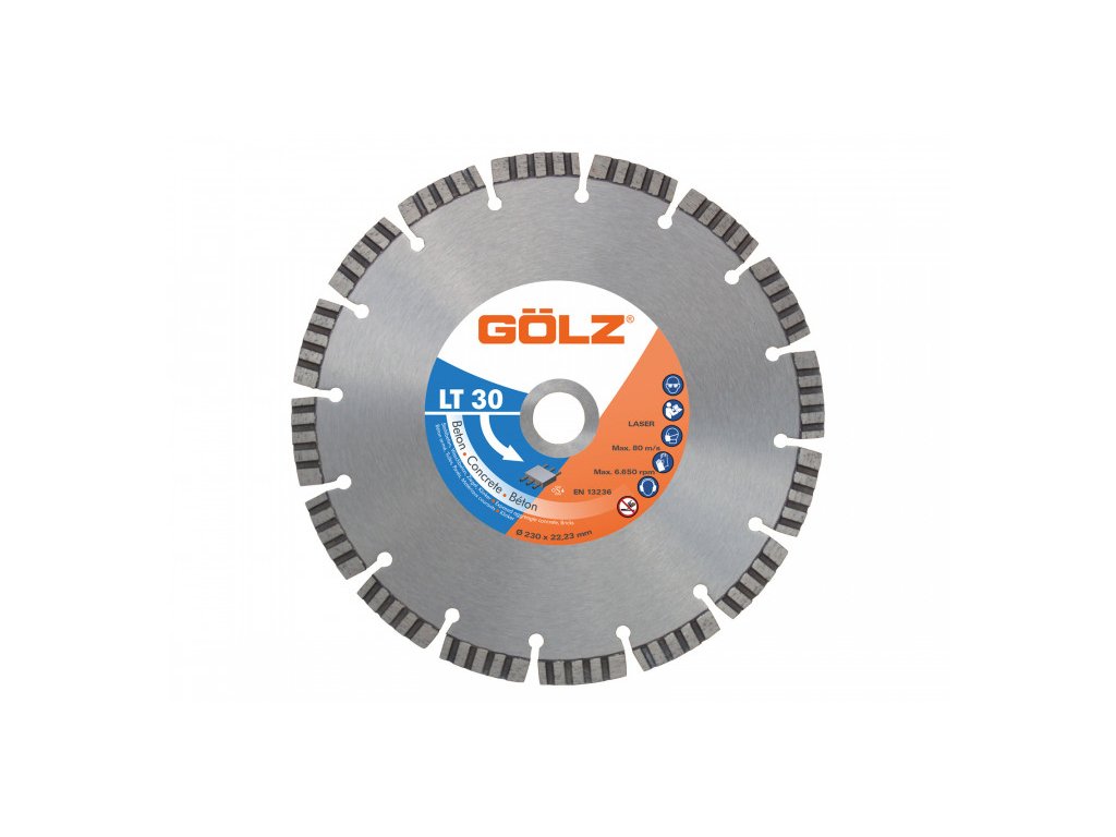 GÖLZ LT30 je univerzální diamantový kotouč pro úhlové brusky s TURBO segmentací, která zlepšuje chlazení, stabilitu řezu a snižuje riziko přehřátí segmentů. Laserem svařované spoje a výška segmentu 10 mm zajišťují jistý výkon v betonu, železobetonu i běžném zdivu a klinkeru. Hodí se pro každodenní práci na stavbě i pro přesné řezání stavebních prvků.