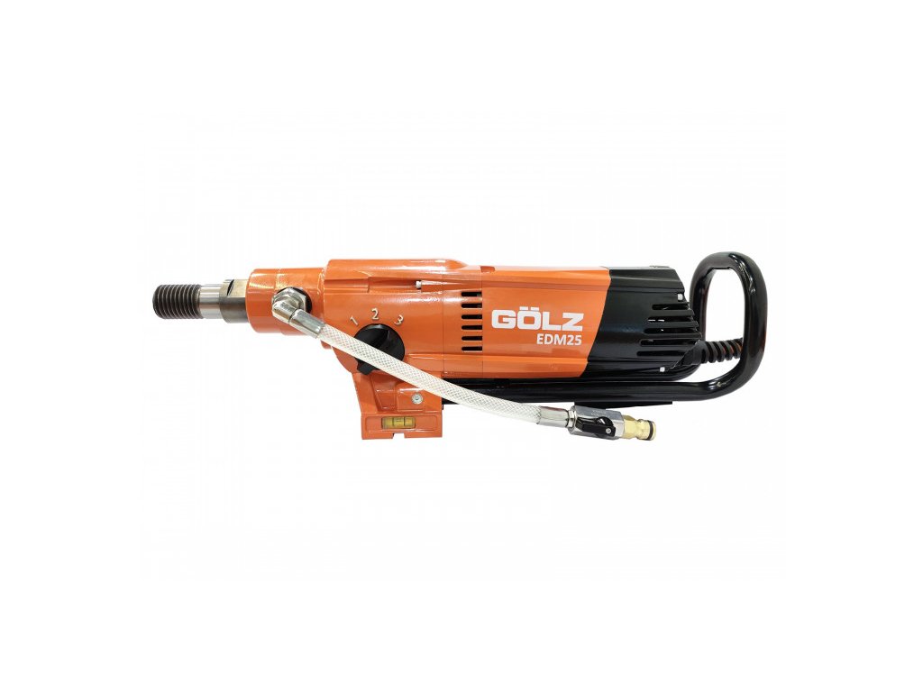 Sestava GÖLZ SD250 + EDM25 kombinuje výkonný 3rychlostní motor 2,5 kW (pro mokré i suché vrtání) s robustním, přesto přenositelným hliníkovým stojanem. Stojan SD250 nabízí hladké kluzné vedení, laserový zaměřovač pro přesné vystředění, rychloupínací systém motoru, kombinovanou základnu (kotva / vakuum), zdvih 600 mm a možnost úhlového vrtání do 45°. Motor EDM25 má elektronický Soft Start, tepelnou ochranu a univerzální upnutí 1¼″ UNC + R½″ s límcem Ø 60 mm a montážní deskou pro přímé připojení ke stojanu. Maximální průměr vrtání v této sestavě je Ø 250 mm.