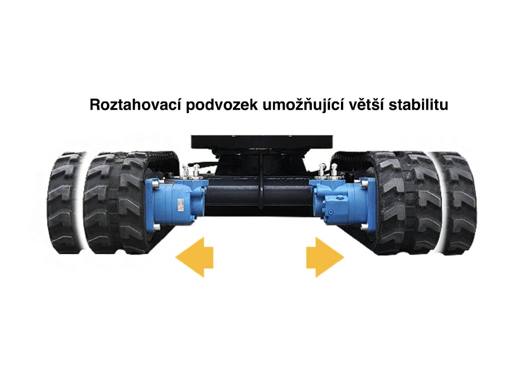 Hydraulicky nastavitelný podvozek umožňuje vjezd i do úzkých průchodů (90 cm), a po roztažení na 110 cmzajišťuje větší stabilitu a bezpečnější práci. -