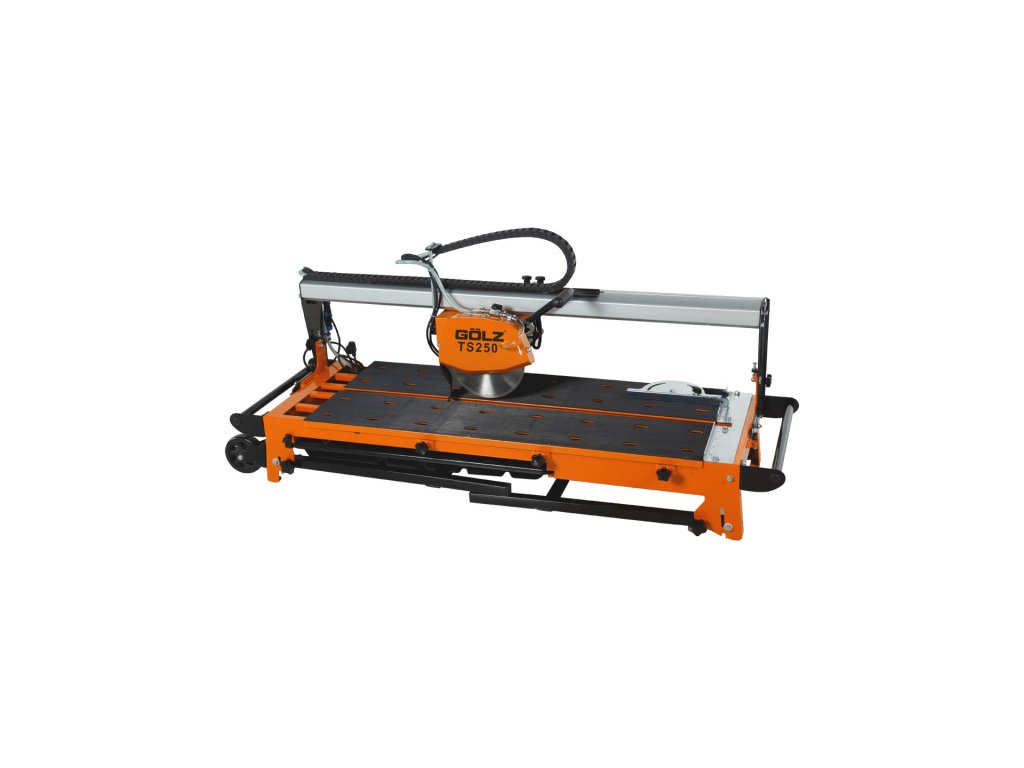 Stolová pila **GÖLZ TS250** je robustní, přitom mobilní řešení pro profesionální řezání keramických, kamenných či dlažebních materiálů. Konstrukce vychází z mostového systému s ručním posuvem a sklápěcí řezací hlavou pro přesné úhlové řezy (Jolly) až do 45°. Skládací nohy, transportní kolečka a konstrukce pro snadný transport umožňují snadné přemístění přímo na staveniště.