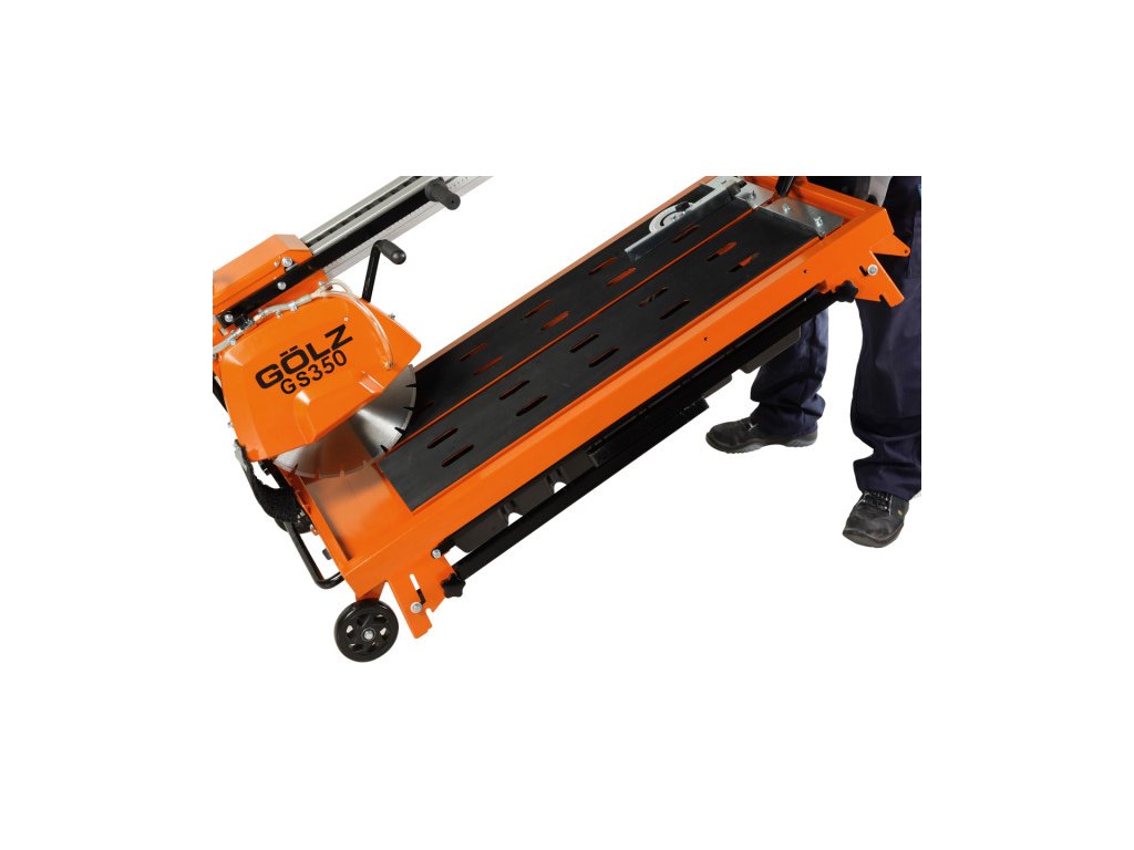 GÖLZ GS350 je výkonný bridge saw navržený pro precizní a náročné řezání v kamenictví, obkladačských výrobách či dílnách. Je osazen motorem 2,2 kW (230 V, IP54) s otáčkami 2 800 min⁻¹. Maximální hloubka řezu je 110 mm při použití kotouče Ø 350 mm. Hlava stroje lze nastavit do úhlu až 45° pro Jolly řezy. Konstrukce poskytuje skládací nohy pro snadný transport, odnímatelnou vodní vanu a pracovní stůl pro snadné čištění, elektrické čerpadlo s rychloupínáním, ochranný štít proti stříkající vodě a kabelovou ochrannou řetězovou cestu. Délka řezu je standardně 1 000 mm, s možností prodloužení až 1 200 mm. :contentReference[oaicite:1]{index=1}