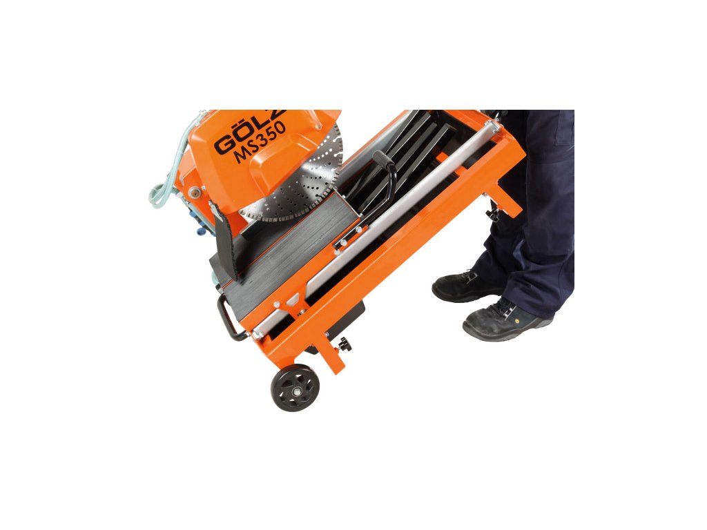 GÖLZ **MS350C** je robustní a zároveň přenosná kamenná pila navržená pro zákazníky, kteří hledají kombinaci výkonu a mobility. Disponuje motorem o výkonu 2,2 kW (230 V, IP54) s otáčkami 2 800 min⁻¹, který umožňuje hloubku řezu až 110 mm při použití kotouče Ø 350 mm. Standardní délka řezu činí 560 mm. Stroj váží přibližně 56 kg a je vybaven odnímatelnou vodní vanou, vodní čerpadlo s rychlospojkou (pro snadnou výměnu), kolečky pro snadný přesun, a krytem kotouče pro bezpečnou obsluhu. Pracovní stůl má rozměry 400 × 400 mm. Ochranný kryt je odnímatelný pro snadnější výměnu kotouče.