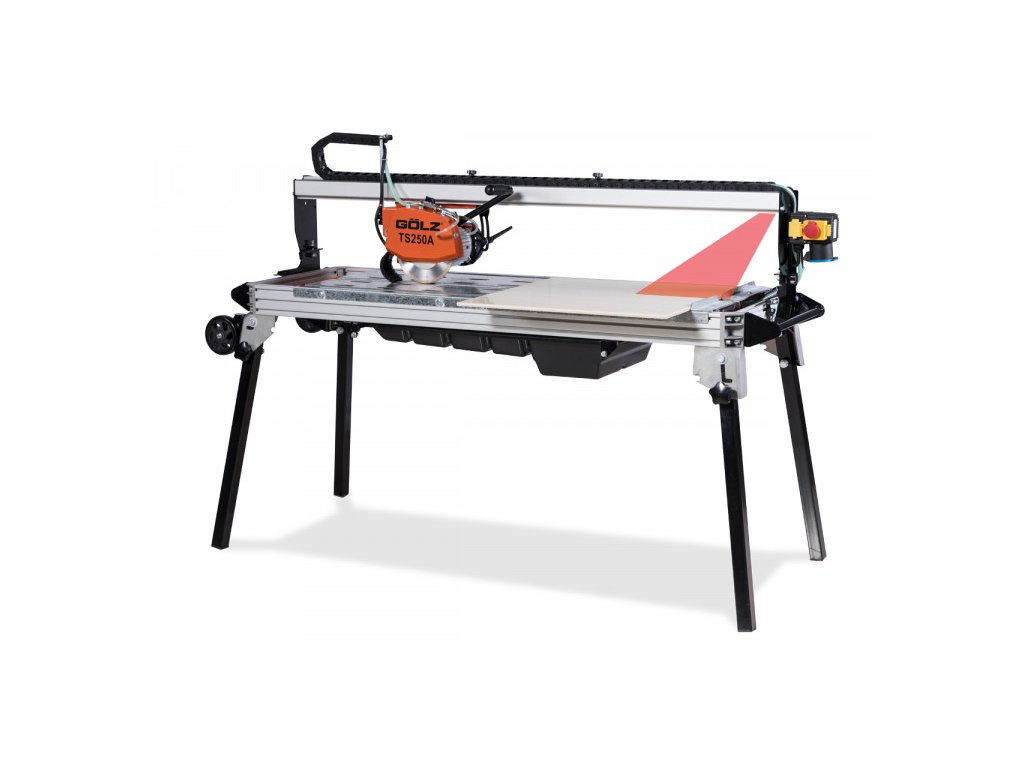 GÖLZ TS250A je výkonná a univerzální stolová řezačka pro mokré diamantové řezání obkladů a dlaždic. Disponuje motorem 1,3 kW (230 V / IP54) a otáčkami 2 800 min⁻¹. Hlava je sklopná pro **Jolly řez až 45°**, je vybavena laserovým zaměřovačem a systémem rychlého zajištění bez nářadí. Konstrukce zahrnuje odnímatelnou vodní vanu a pracovní stůl pro snadné čištění, skládací nohy a transportní kolečka pro mobilitu. Délka řezu dosahuje 1 300 mm, hloubka řezu až 50 mm.